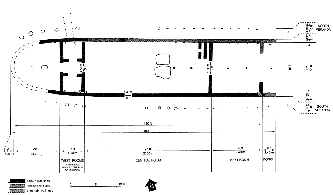 Simple in design, the heroon is an elongated building that is apsidal at the front and has a blunt, covered porch at the back. Inside, the floorplan between the porch on the east side and the apse on the west are an east room, central room, and two west rooms.[12] Based on Figure 1, the exterior of the building is roughly 160 feet long, 30 feet wide wall to wall or 46 feet wide beneath the verandas.[13] The east room is approximately 900 square feet, the central room is 2,250 square feet, and the west rooms nearly 188 square feet each with a 5 feet wide hallway between them. In total, the building was over 4,000 square feet: an enormous endeavor.